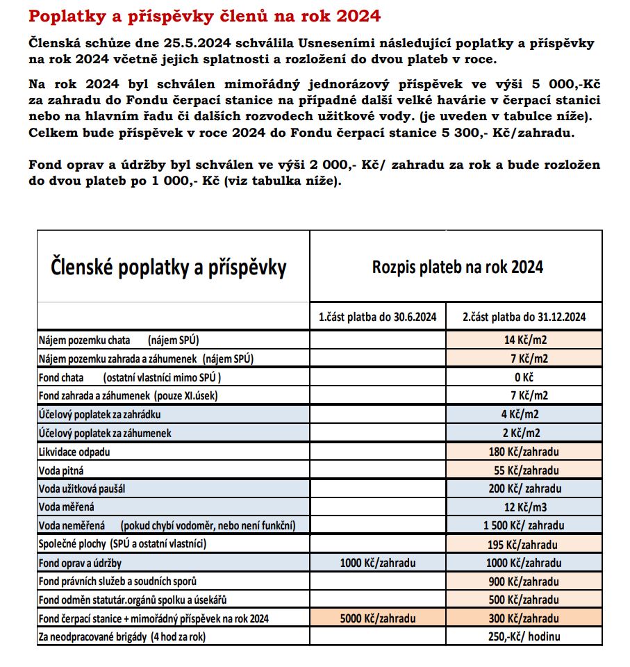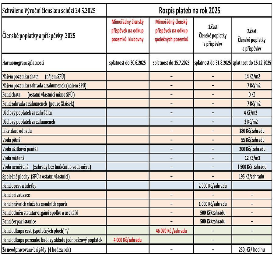 Členská schůze dne 24.5.2025 schválila následující členské poplatky a příspěvky pro rok 2025 a jejich rozložení do 4 termínovaných plateb: