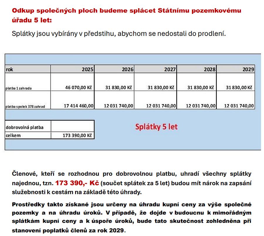 do 15.7.2025 – 46.070,-Kč – mimořádný poplatek 1. splátky odkupu společných ploch (po dobu 5 let – viz tabulka)